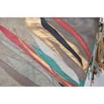 This oversized sexy vintage burlap clutch purse has colorful patch leather strips applied to the face. Has a multicolor tassel on the zip.  Zip to closes.  Interior is fabric lined with one pocket.