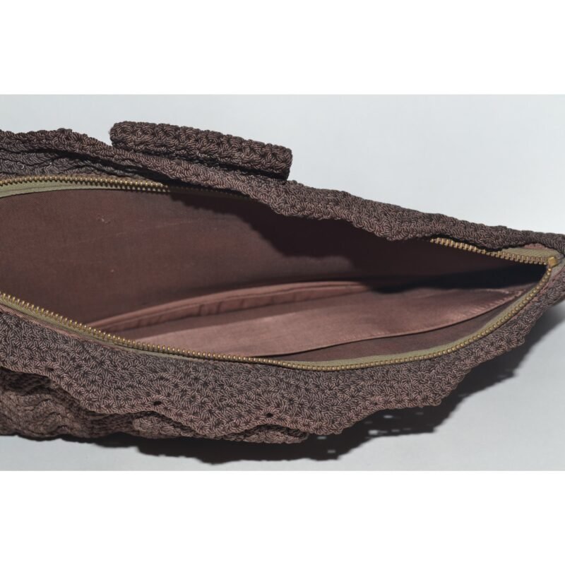 This 1940’s chocolate crocheted fan clutch purse has a pom-pom handle. Interior is fabric lined with one pocket.   16W