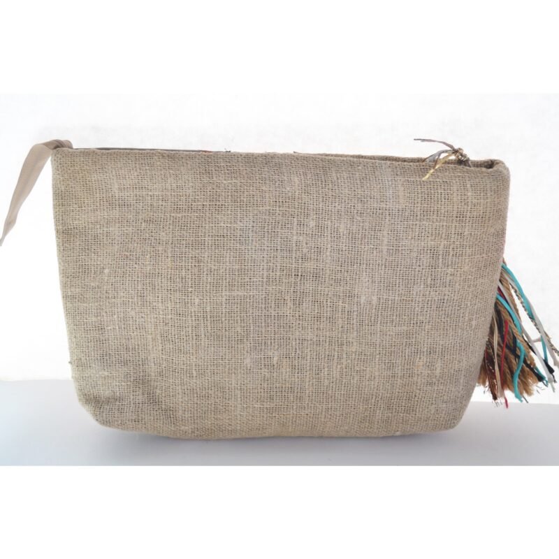 This oversized sexy vintage burlap clutch purse has colorful patch leather strips applied to the face. Has a multicolor tassel