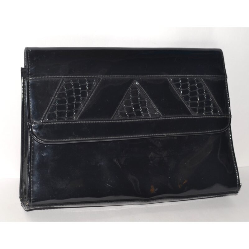 This vintage black high gloss clutch purse is embossed on the face. Interior is fabric lined with one zip pocket.