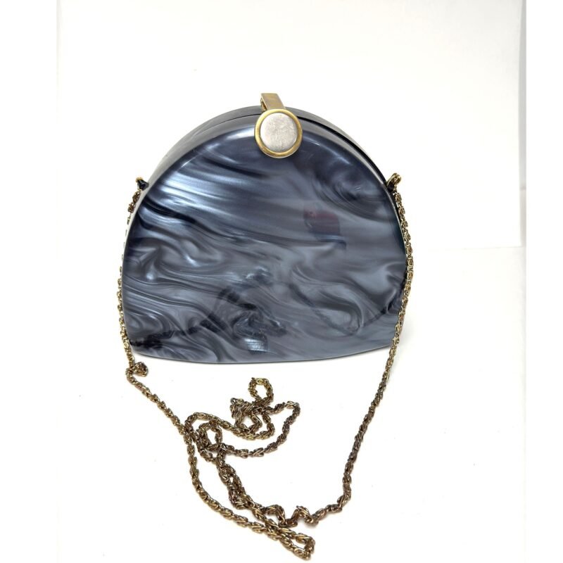 This unique dome shaped grey marbled lucite plastic purse has a long optional shoulder strap.  Or for a more elegant