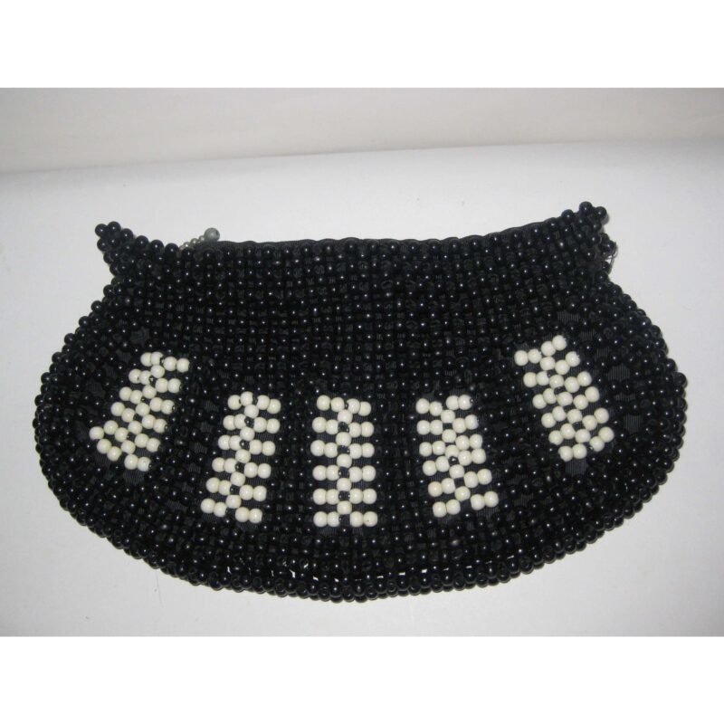 This cute black & white beaded evening purse has fabric interior with one pocket. Solid black on reverse side.     9W