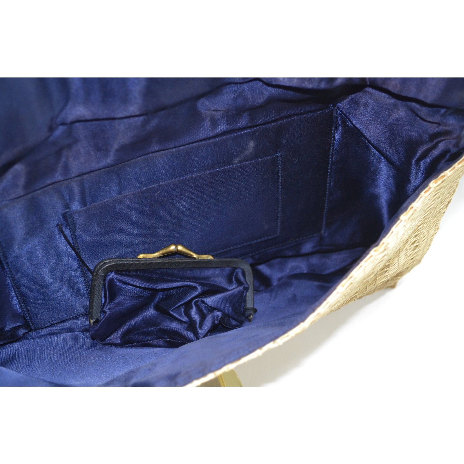 This vintage fabric clutch purse has a woven straw overlay is from Mam-Selle Originals, it has a carved Bakelite clasp. It is fabric lined with 2 pockets and attached coin purse.