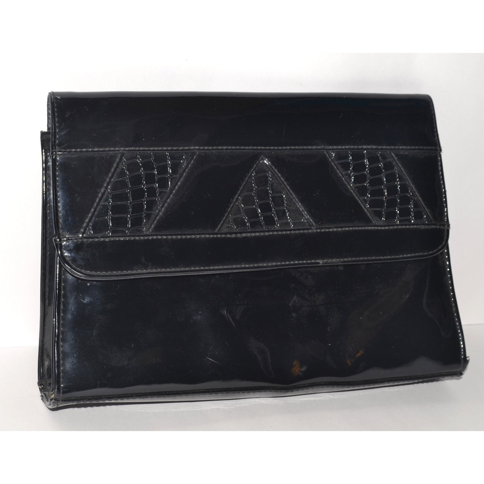 This vintage black high gloss clutch purse is embossed on the face. Interior is fabric lined with one zip pocket. Has two interior compartments.