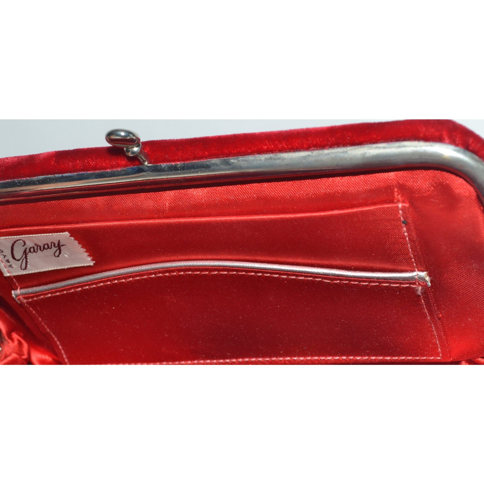This vintage sultry red velvet evening clutch purse is from Garay. Interior is red satin lined with 2 pockets.